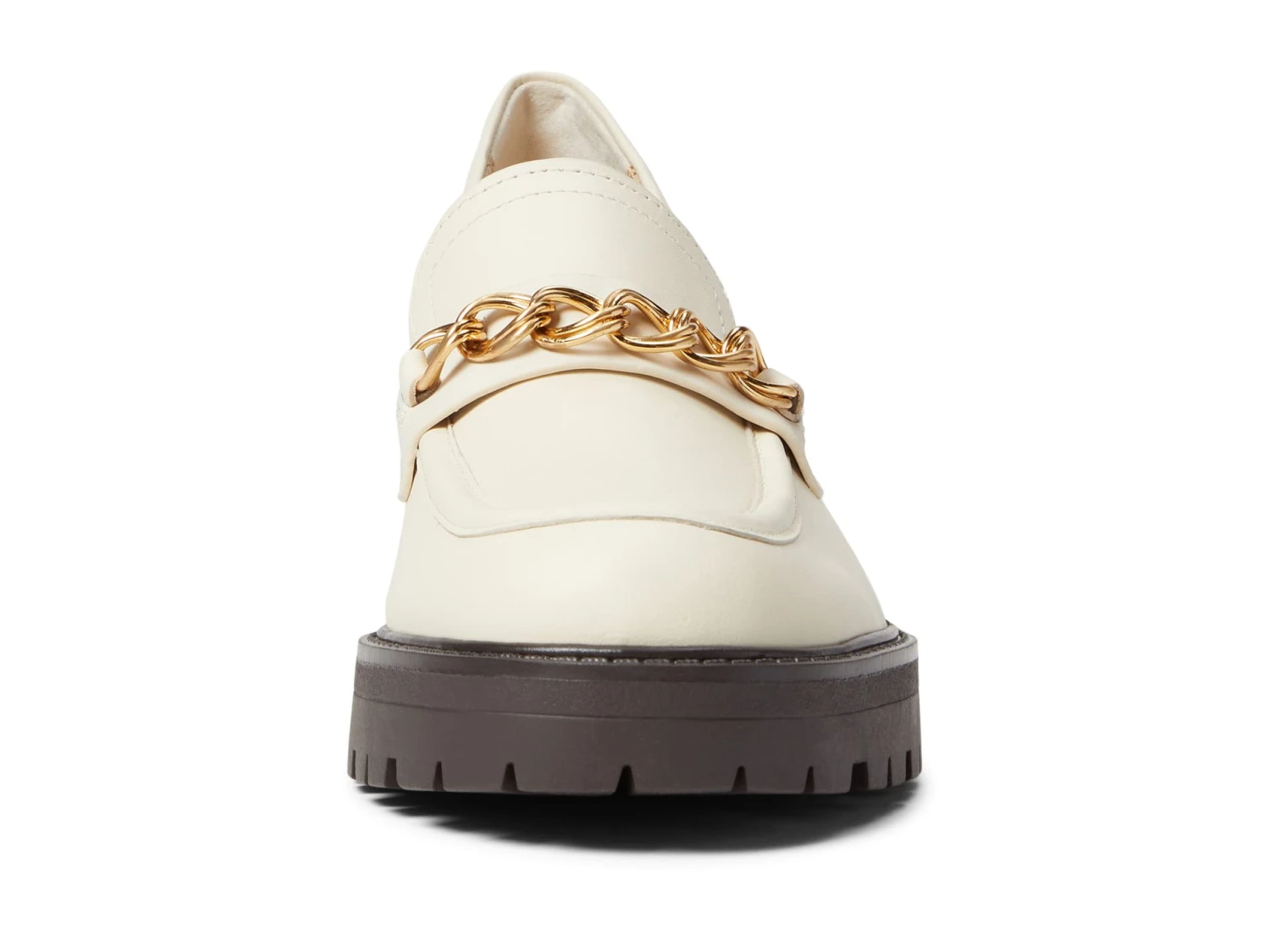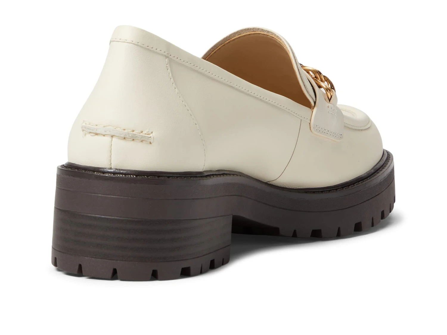 - Slip-on heeled loafer with round toe and front metal chain accent.